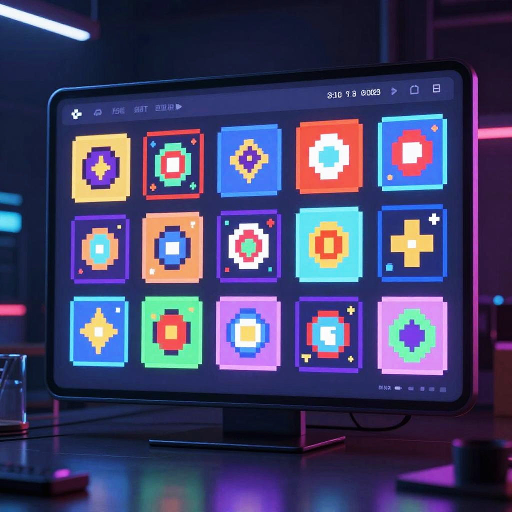 AI pixel art generator free interface showcasing a futuristic digital screen with vibrant pixel art creations in progress, neon colors glowing, sleek minimalist cyberpunk style, detailed pixel textures, dynamic lighting, high resolution, creative digital art studio vibe