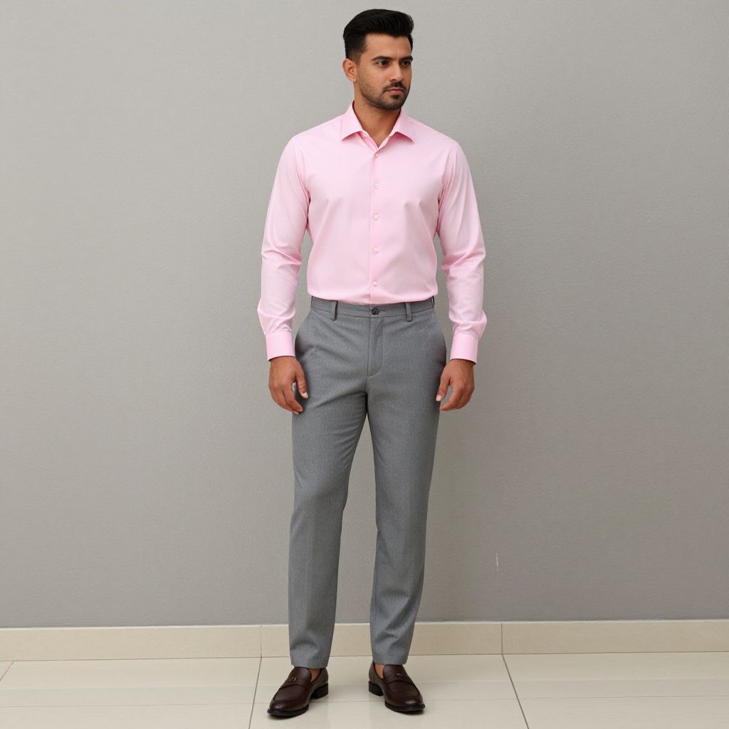 Photograph of a South Asian man standing against a plain light gray wall. He has short black hair, a neatly trimmed beard, and medium brown skin. He is wearing a long-sleeve, light pink dress shirt with the top button undone and gray, straight-legged dress pants with a belt. His brown leather shoes are polished. The floor is white tiled, and the lighting is even, highlighting his formal attire. His posture is straight and confident, with his hands relaxed by his sides.