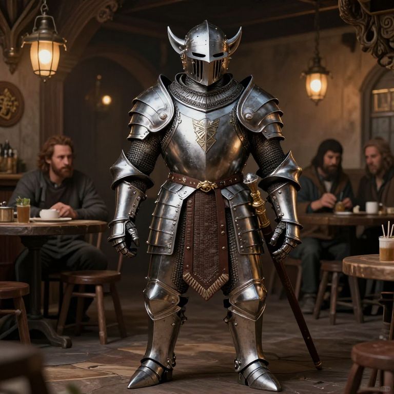 Photograph of a knight in full, shiny silver armor with a horned helmet standing in a dimly lit medieval-style tavern. The armor features intricate details and a woven fabric tunic at the back. Two men with beards, dressed in dark clothing, sit at wooden tables in the background, one holding a mug. Warm yellow lanterns hang from the stone walls, casting a soft glow. The floor is wooden, and the setting has a rustic, historical feel.