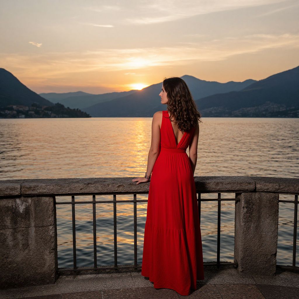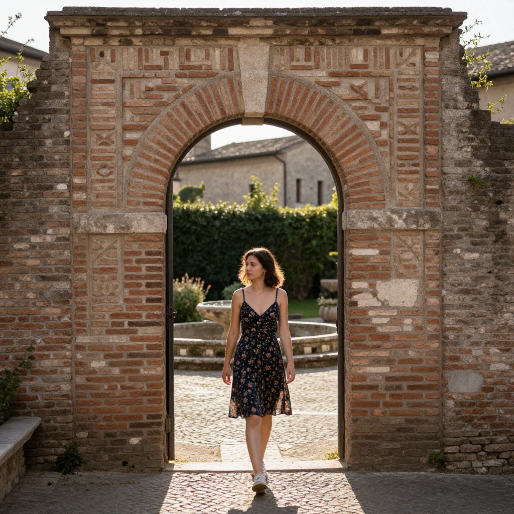 An old brick archway carved with simple geometric patterns, set within a cobblestone courtyard of a historic inn in central Italy. The archway is partially open, allowing a view of a stone garden and a fountain in the distance. A young woman in a floral dress walks slowly beneath it, her face turned slightly to the side with soft, warm afternoon light hitting her hair and shoulders.
