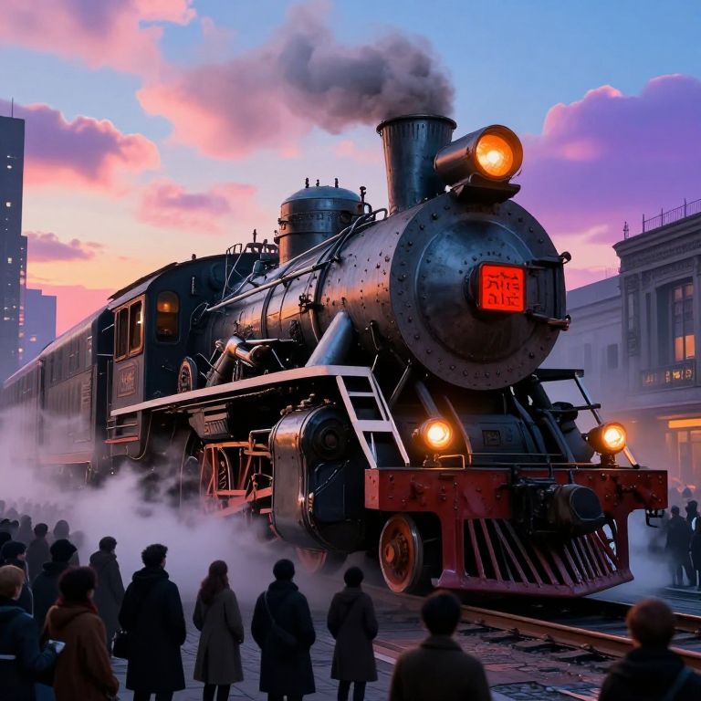 A melancholic train composed of upside-down carriages floats through a sky river, passengers peering into mirrored clouds reflecting alternate lives.