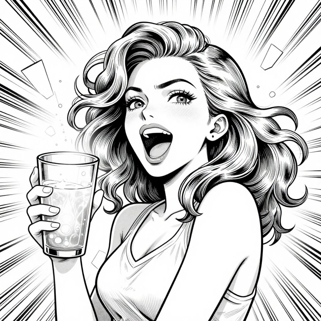 Black-and-white manga-style drawing of a smiling woman with wavy hair, holding a glass, mouth open in excitement, radiating lines in background.