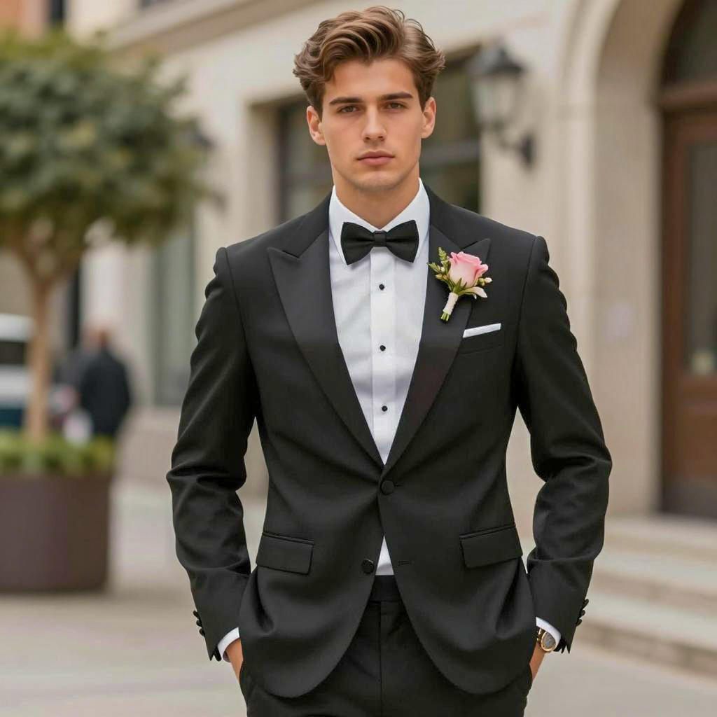 Smart casual male wedding, photorealistic portrait, young man, handsome, medium build, short brown hair, wearing black tuxedo, white dress shirt, black bow tie, pink boutonniere, hands in pockets, standing in outdoor urban setting, blurred background with greenery and stone columns, natural light, daytime, slightly serious expression, polished and stylish, high quality photography, detailed ures, sharp focus on subject, slightly blurred background, realistic colors, professional fashion photography style