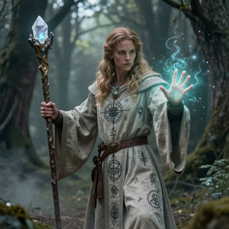 Caster in a medieval fantasy forest clearing, dressed in flowing robes covered with arcane symbols, holding a staff topped with a crystal, summoning elemental spirits with glowing hands, enchanted atmosphere with mystical fog and sparkling light particles.