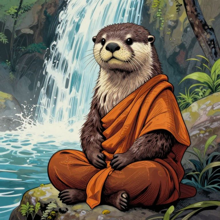 Animal Art anthropomorphic otter monk meditating near a waterfall, muppet, intricate details, colored inks style, graphic novel style, oilpaints style, 8k,