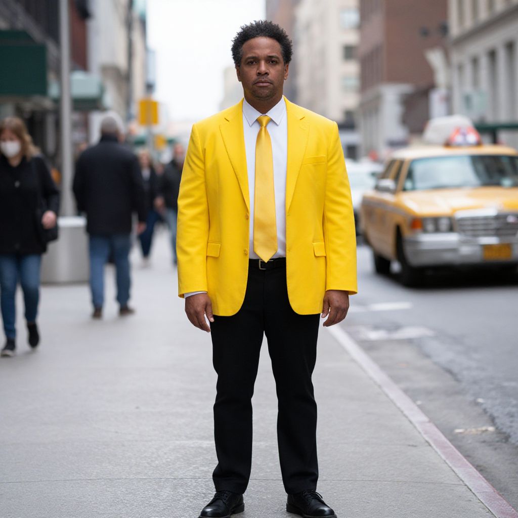 "Yellow Cab Costume, man in a yellow jacket and tie standing on a city street"