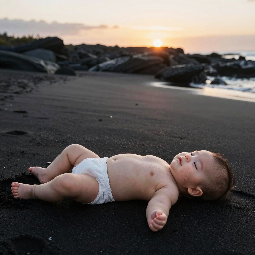 Volcanic ash baby lying peacefully on black sand beach, soft ash dusting over skin, lava fields fading into horizon, warm volcanic twilight lighting, dreamlike and cinematic composition