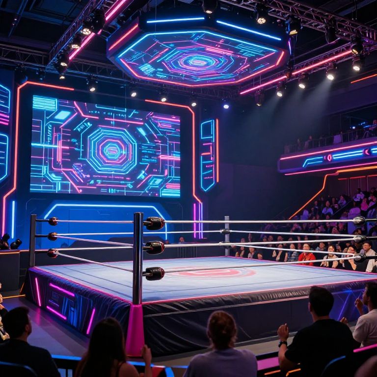 Futuristic wrestling ring background surrounded by neon lights and holographic displays, sleek chrome ropes and elevated platform, futuristic arena filled with vibrant colors and excited spectators, blending sports with sci-fi aesthetics