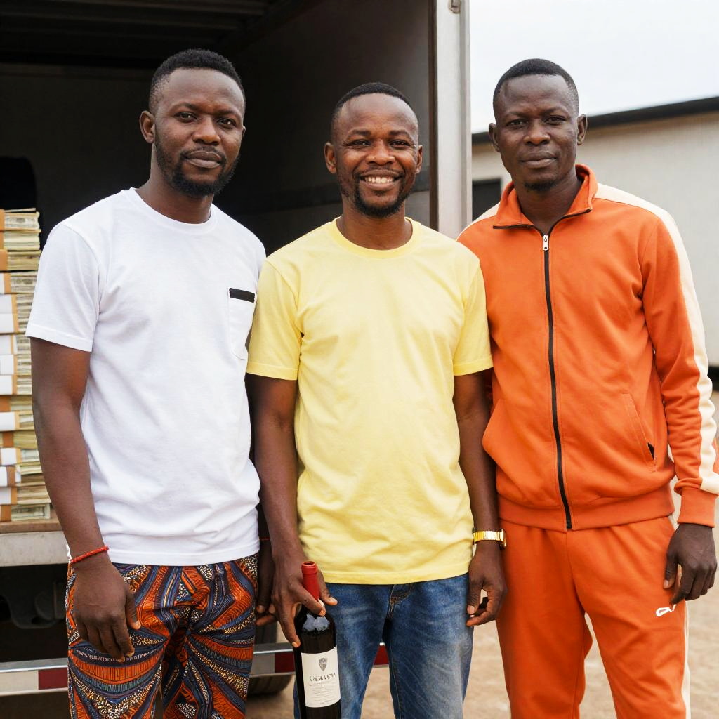 Photograph of three Black men standing close together. Left man in white shirt and patterned pants, middle man in yellow shirt holding a wine bottle, right man in orange tracksuit. Background has a truck, stacks of money, and a banner. Middle man smiles, left and right men have neutral expressions.