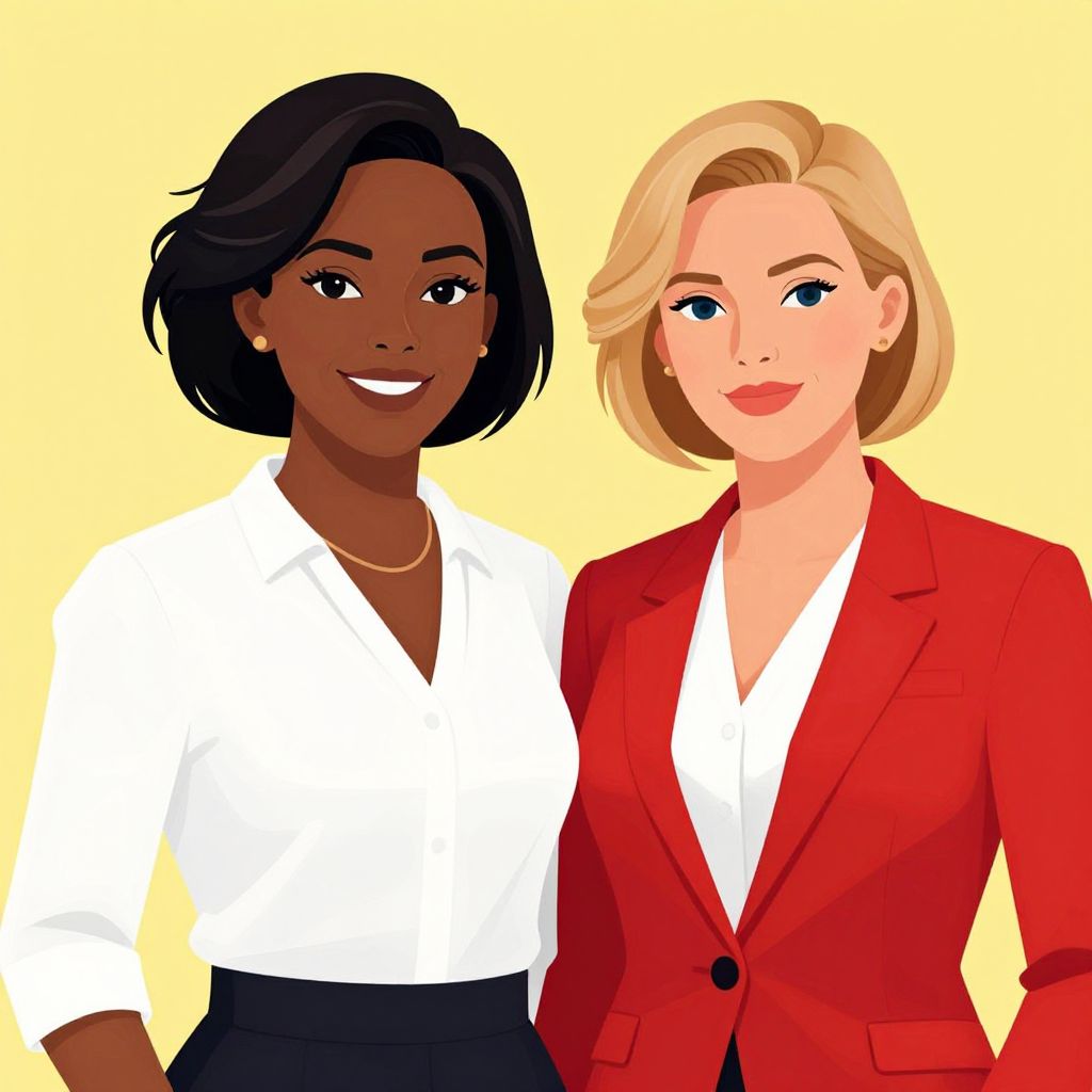 A vibrant digital illustration featuring two women in professional attire—a black woman in a crisp white blouse and a white woman in a bold red blazer—symbolizes unity and solidarity, evoking themes of sisterhood and empowerment reminiscent of \"The Help.\