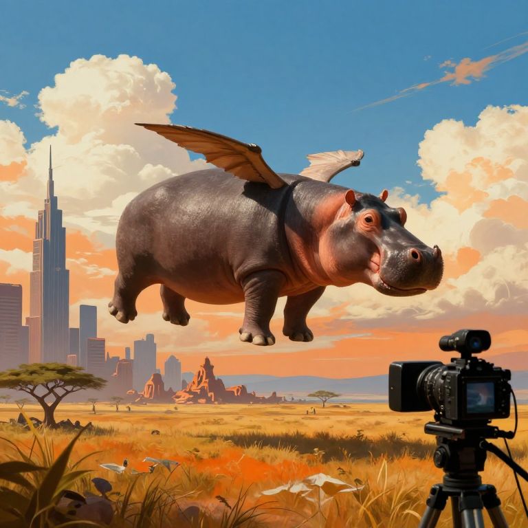 Side view of a hippo with tiny fairy wings flies above the savanna, set against a breathtaking, dystopian cityscape with sleek skyscrapers and ancient, crumbling architecture on the horizon, under a brilliant, orange-blue sky with puffy, white clouds, rendered in a highly detailed, matte painting style with a bold, contrasting color palette and deep, rich textures, reminiscent of the works of Simon Stalenhag, Ash Thorp, and Loish, with a cinematic, 8k resolution quality, evoking the grandeur of an Unreal Engine 5 film still, shot on a virtual v-raptor XL camera, with a warm, film grain and subtle vignette, color graded to perfection, post-processed for a lived-in, atmospheric look, with dramatic, cinematic lighting and a sense of epic wonder