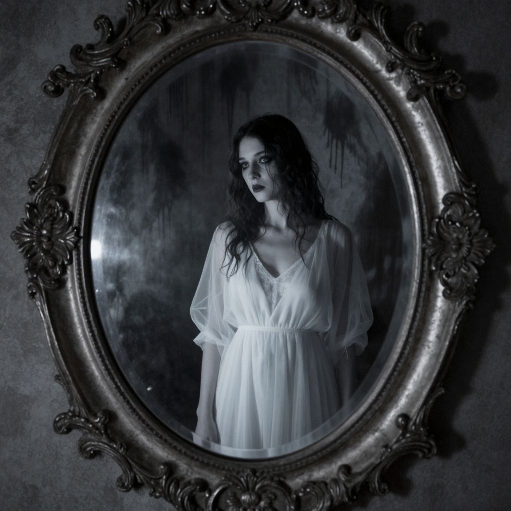 Eerie reflections emerge within an ornate, antique mirror, casting a spectral figure of a woman in a ghostly white dress against a backdrop of dripping shadows and whispers from parallel dimensions.