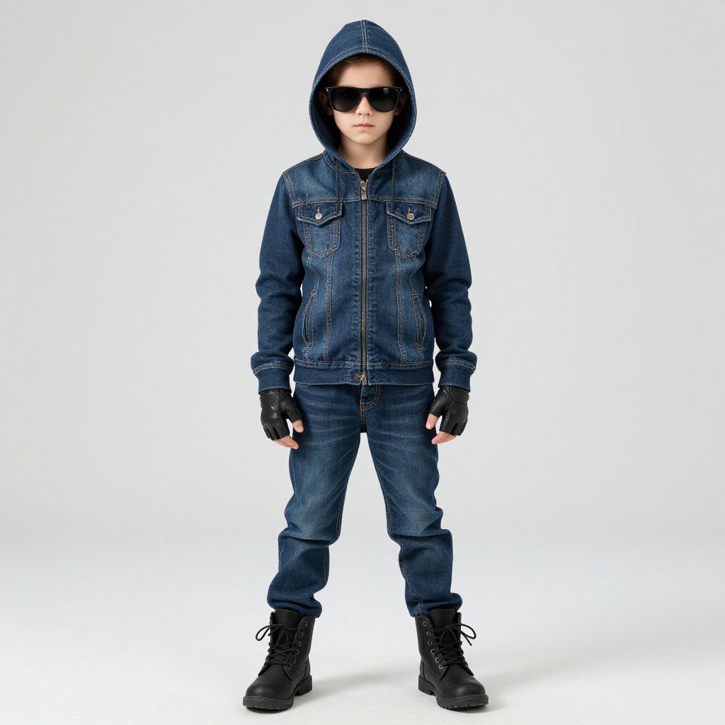 Burglar costume, hood, solo, 1boy, denim, male focus, gloves, jeans, hoodie, pants, fingerless gloves, sunglasses, standing, boots, full body, hood up