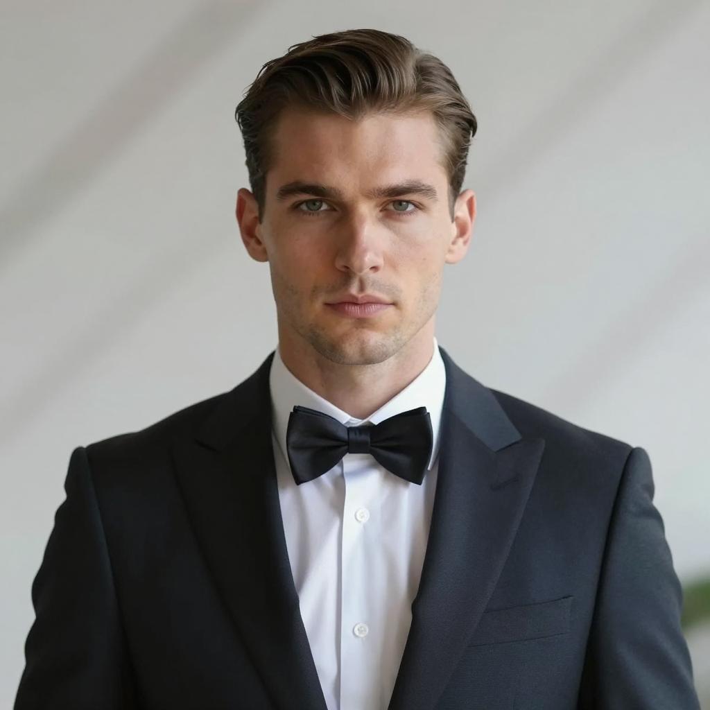 A handsome man with slicked-back hair, wearing a dark suit, white shirt, and bow tie. He stands facing forward with a serious expression. The background is blurred with diagonal light patterns.