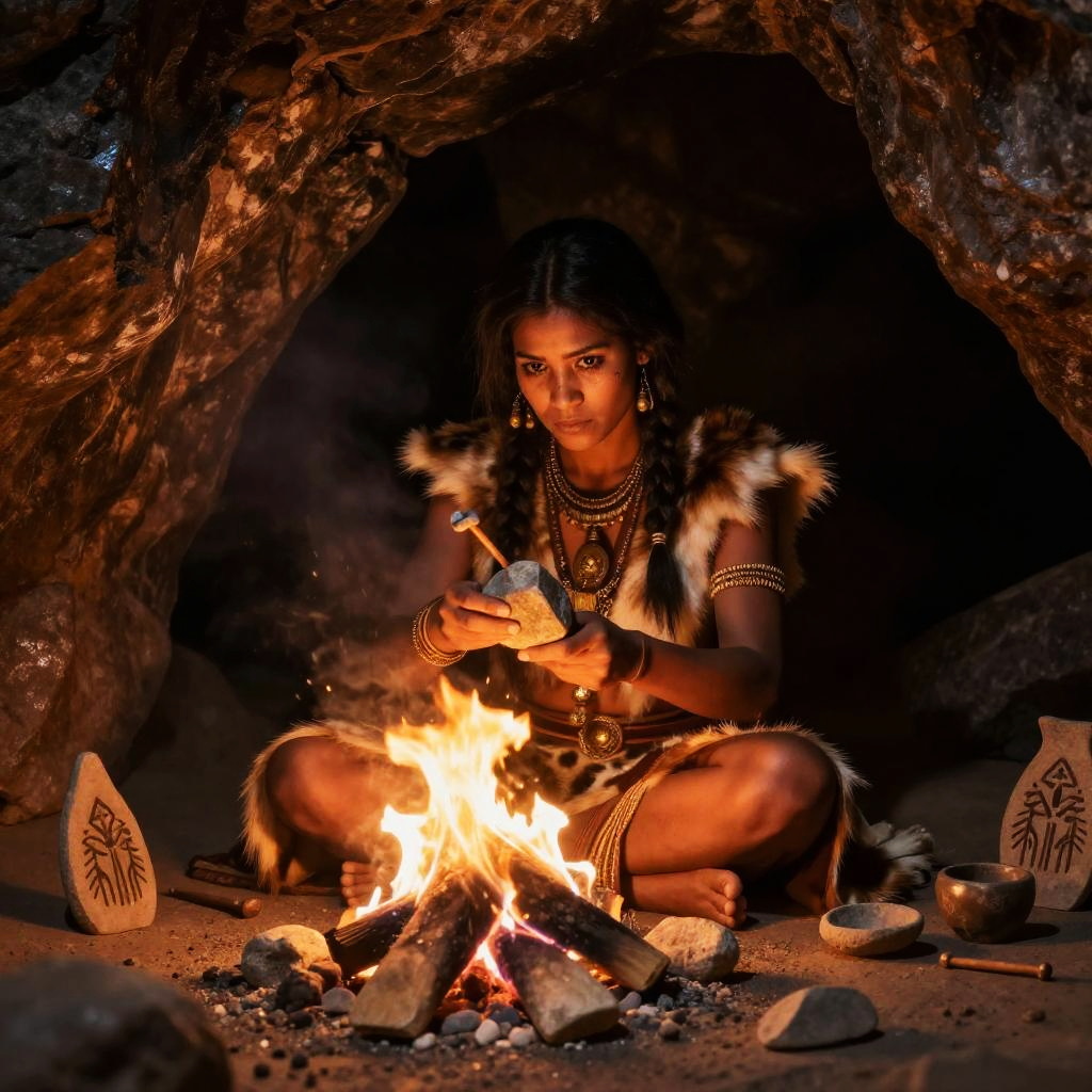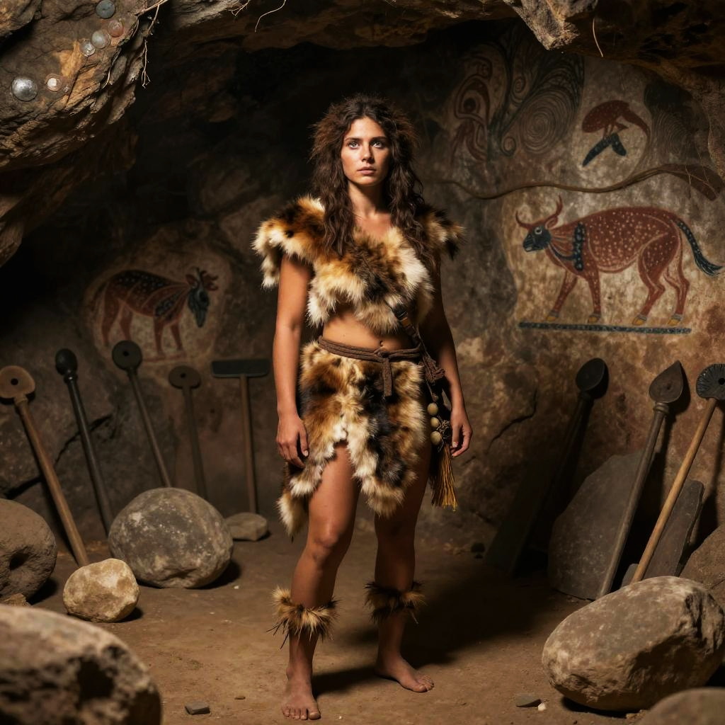 Ancient cave woman standing in a dimly lit prehistoric cave, surrounded by primitive stone tools and wall paintings, wearing animal fur clothing, with wild hair and a determined expression, realistic style, muted earth tones, high detail