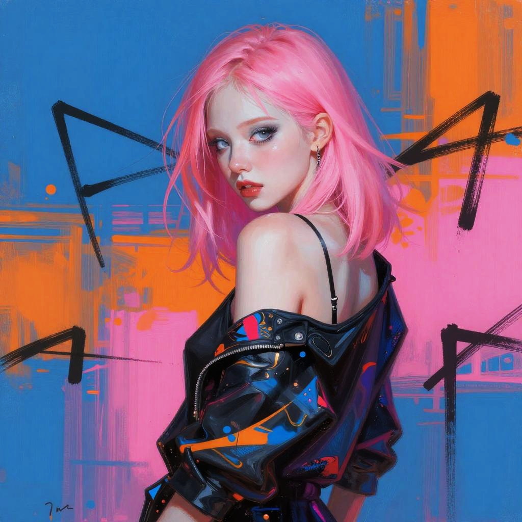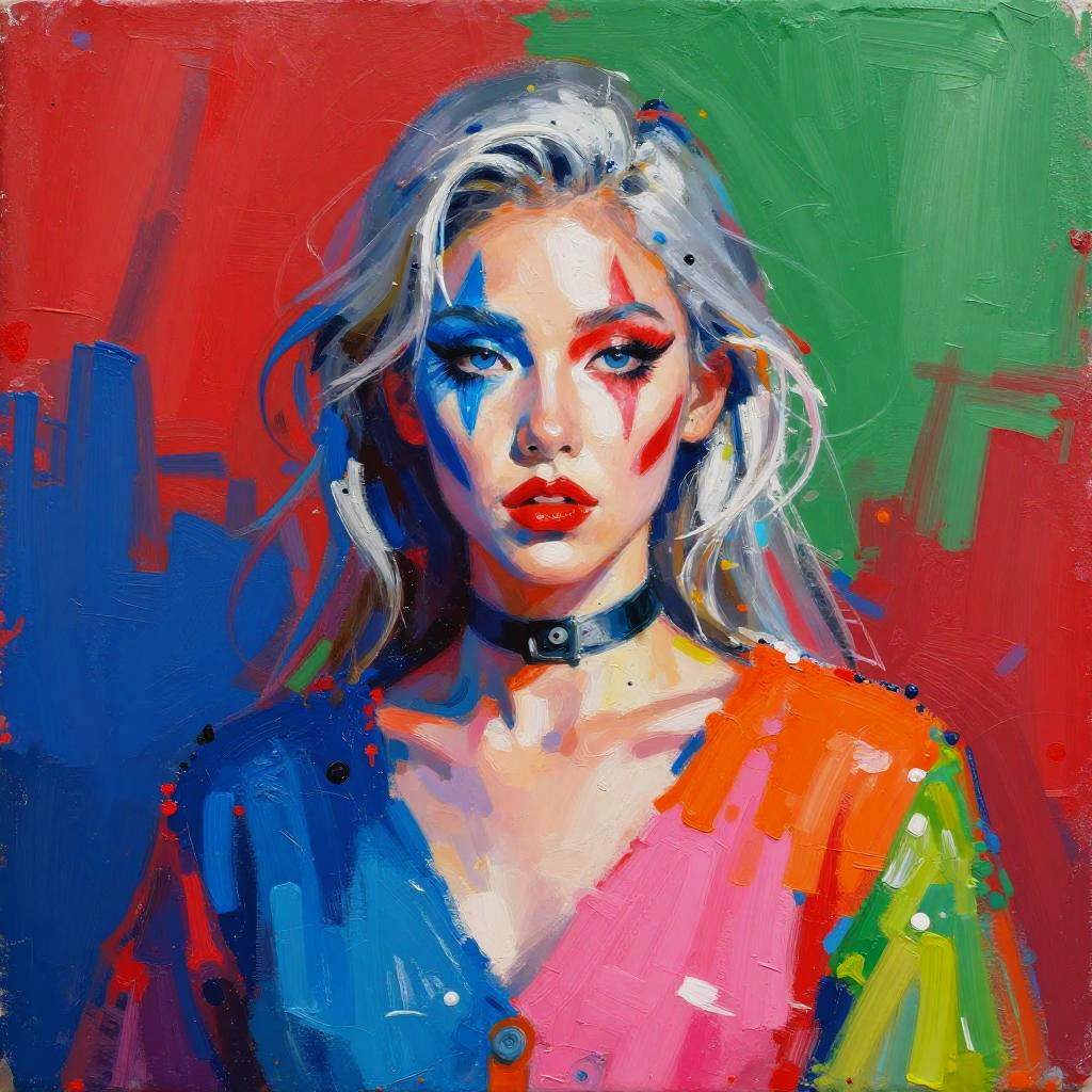 This is a vibrant, colorful painting of a person with striking makeup and clothing. The person has silver hair, blue and red face paint, and intense blue eyes. Their outfit is a mix of bright colors like blue, pink, orange, and green, with a black choker. The background is a bold, abstract mix of red, blue, and green. The style is bold and expressive, with thick, dynamic brushstrokes.