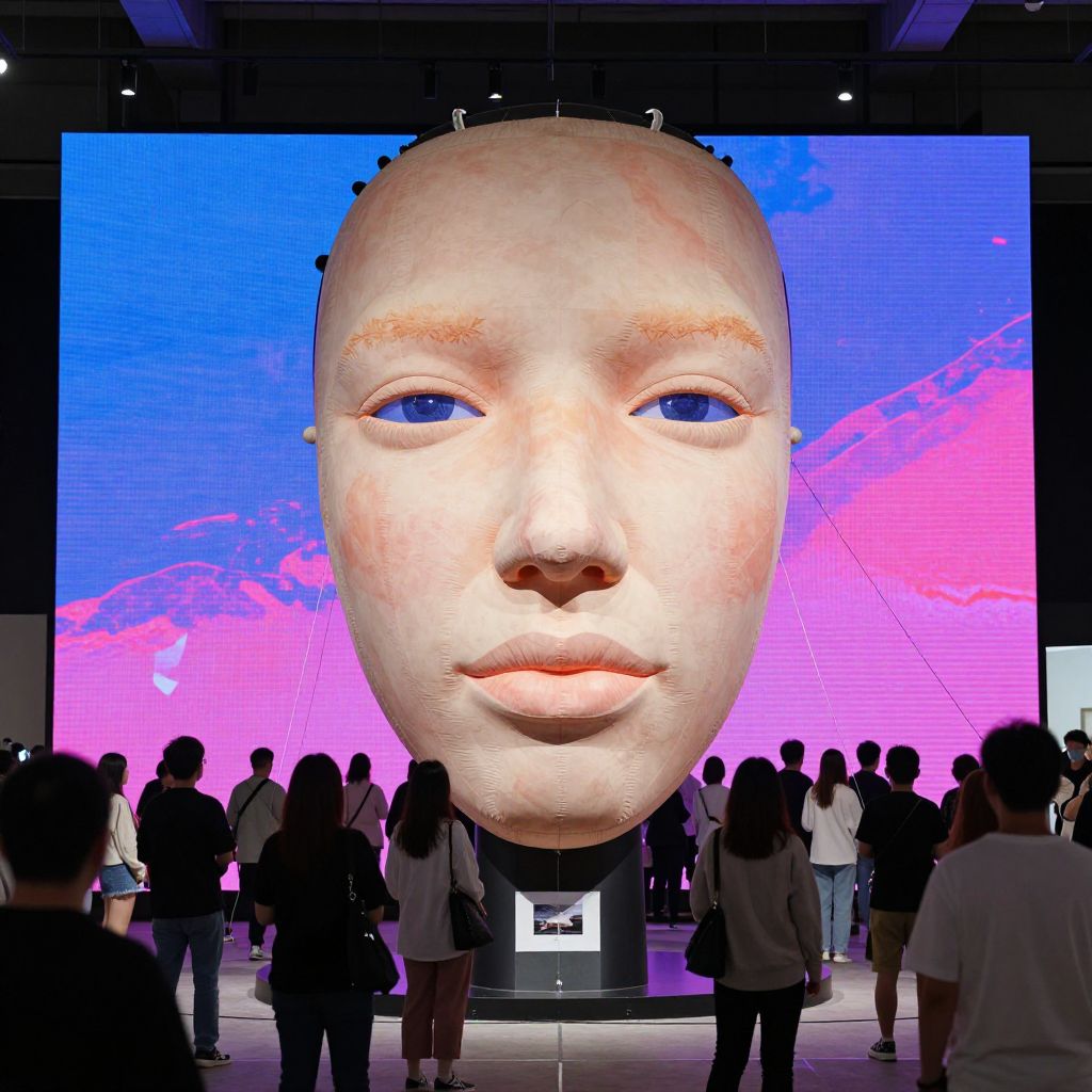 A crowd gathers around a large inflatable human face sculpture displayed on a vividly colored digital screen, creating a surreal and futuristic exhibition scene.