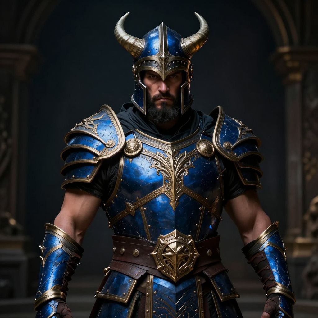 Photograph of a muscular, bearded man with a serious expression, standing in a dimly lit, gothic-style room. He wears intricate, blue metallic armor with gold accents, including a horned helmet. The armor is detailed with patterns and a large, ornate star-shaped belt buckle. His arms are muscular and his chest is broad. The background features dark, arched stone structures, adding to the medieval and fantasy aesthetic. The lighting highlights the metallic sheen of his armor, creating a dramatic and powerful effect.