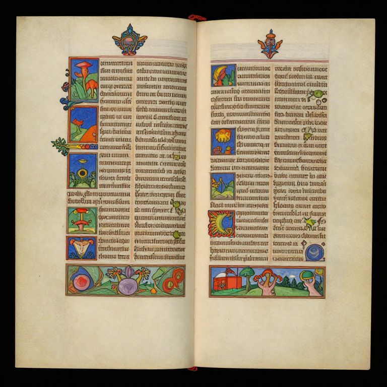 Elaborately illuminated manuscript pages burst with fantastical ornamentation, where ornate initials sprout into vibrant, otherworldly landscapes, defying the boundaries between text and imagination.