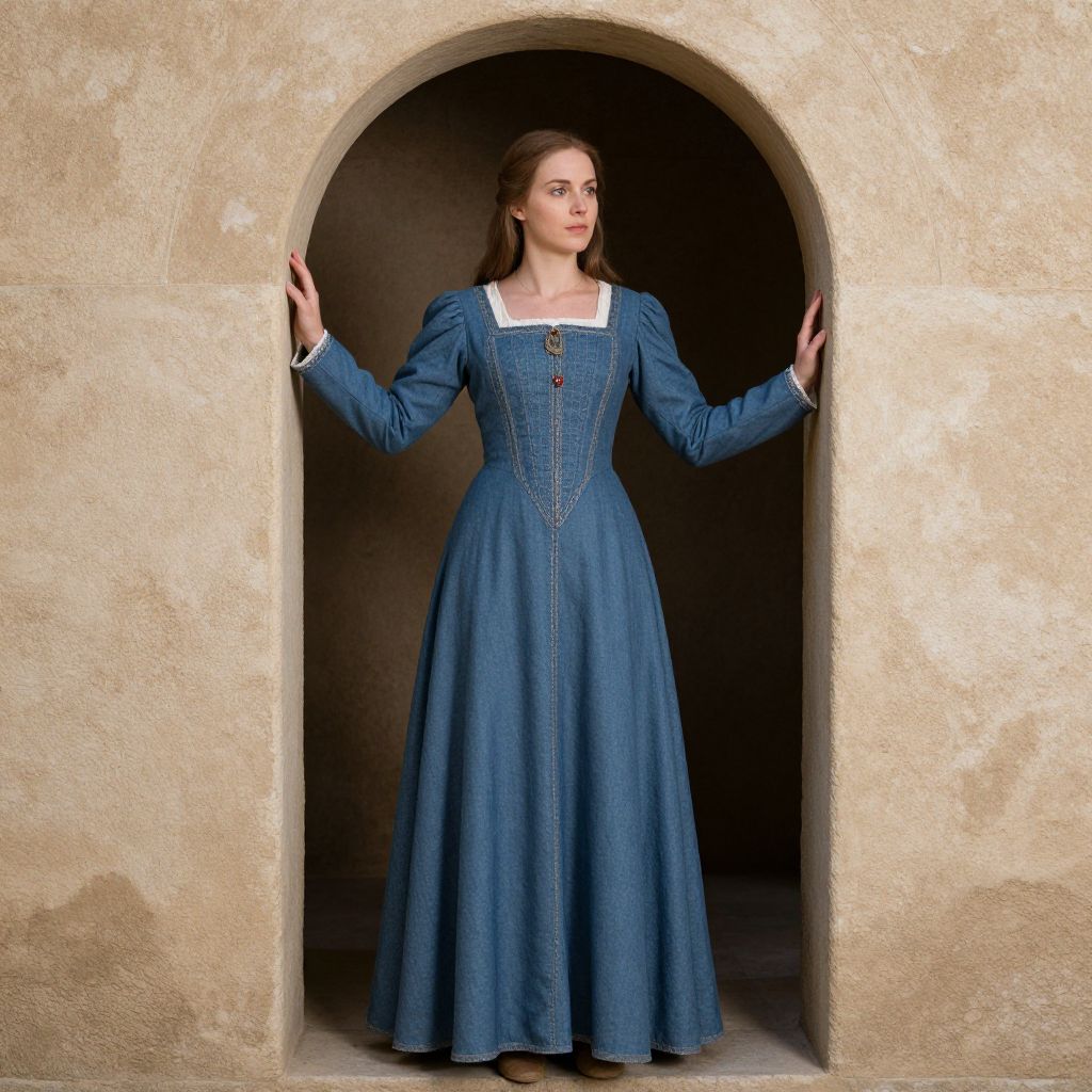 Photograph of a fair-skinned woman with brown hair standing in a stone archway. She wears a long, blue, medieval-style dress with puffed sleeves, white square collar, and intricate lace-up front. The dress has a textured fabric with subtle patterns. She stands with hands on the archway's sides, looking slightly to her right. The background is a rough, beige stone wall, contrasting with the dark interior of the archway. The lighting highlights her face and dress, casting soft shadows. The overall style is reminiscent of historical or period costume photography.