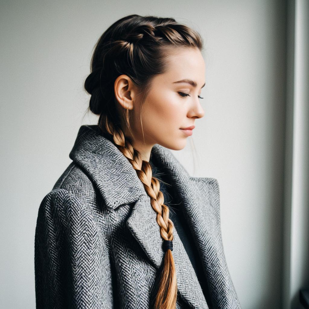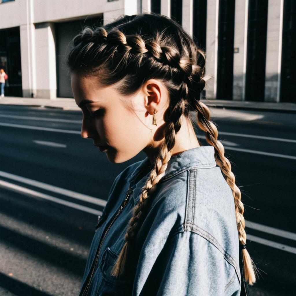 Crown Braid hairstyle on woman, wearing modern streetwear, in urban street, captured in fashion editorial style with dramatic shadows.