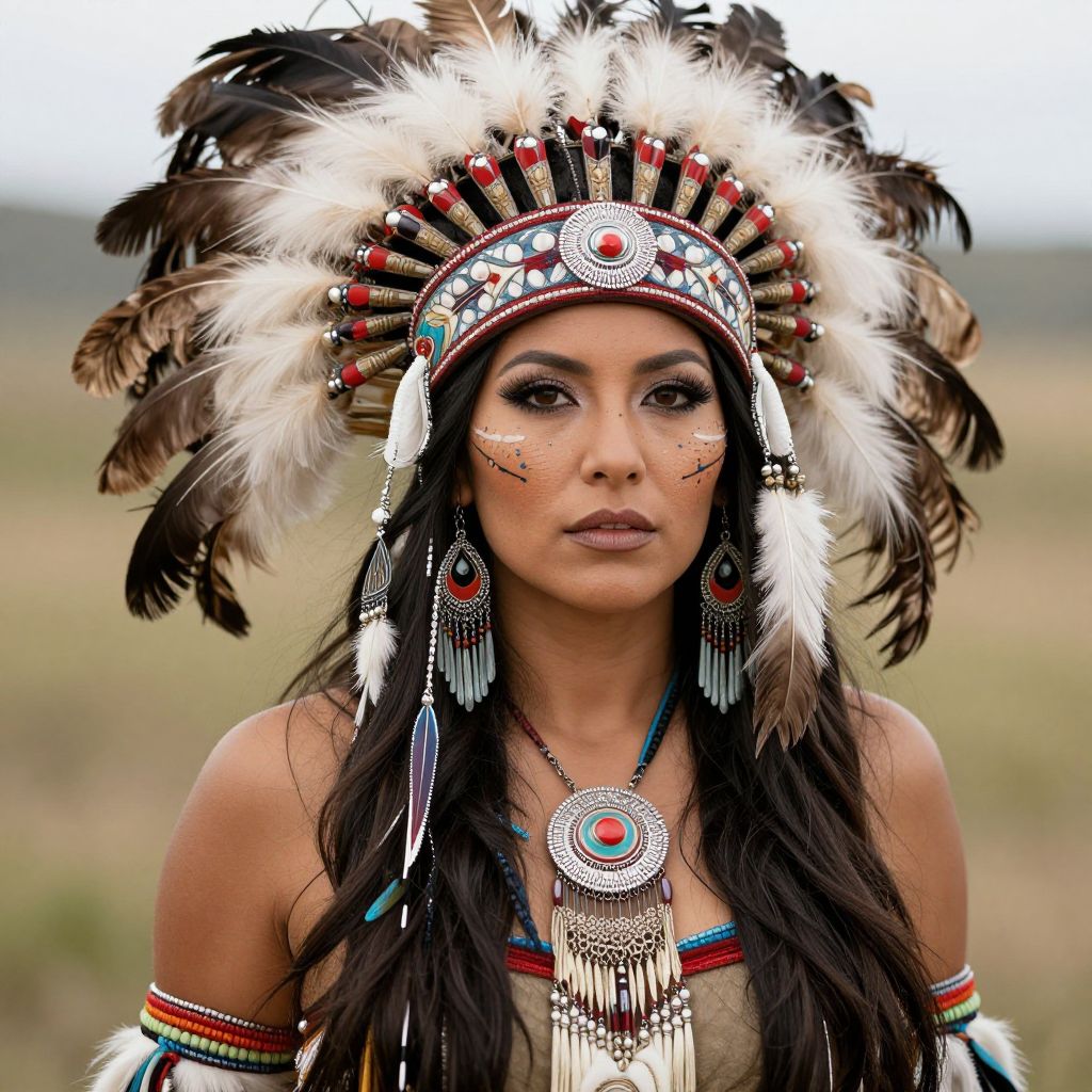 A beautiful Native American woman wearing a full feather head dress, adorned with intricate jewelry and detailed face paint, has long flowing hair and striking eyes.