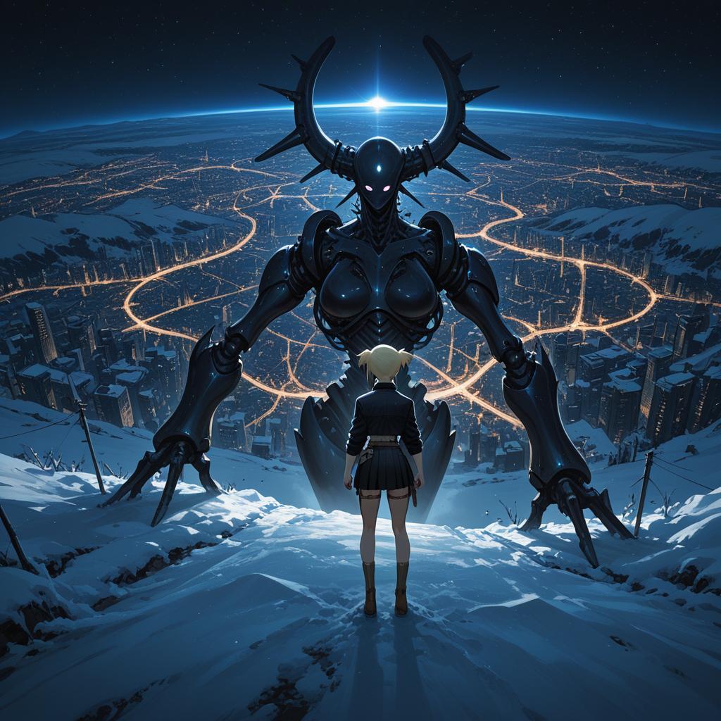 A full-body view of a girl with blonde pigtails standing on a snowy mountain, facing a giant black futuristic robot with glowing purple eyes and large curved horns. The scene overlooks an expansive urban sprawl city lit with streetlights and highways visible from space. The landscape includes snow-covered mountains and rivers under a starry night sky.