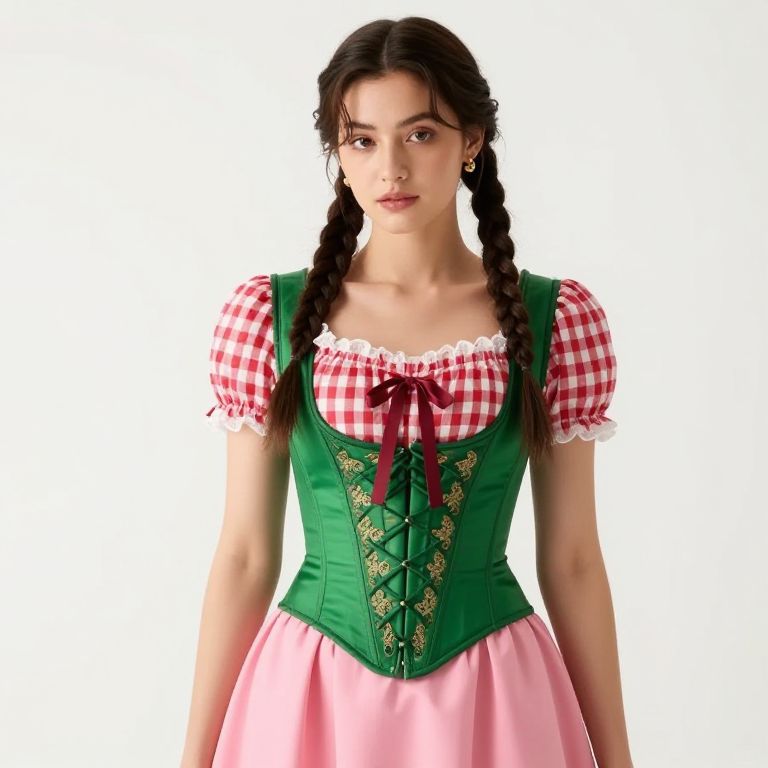 Female wearing a white dress with red accents and a red cape. The dress has a corset and a white skirt with a lace pattern. The cape is draped over her shoulders and she is holding a bouquet of red roses on her head. The background is a patterned wall with gold and green designs.