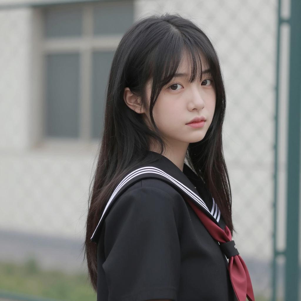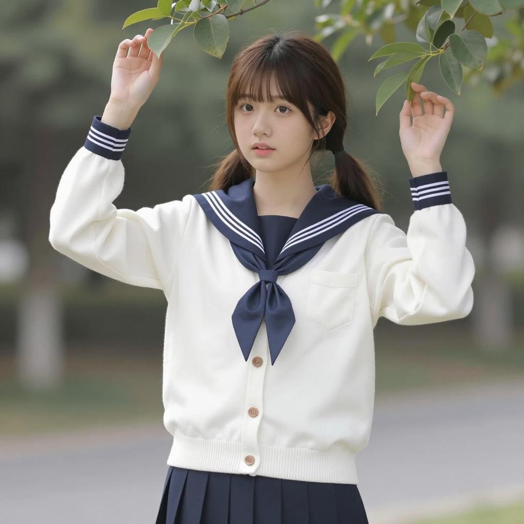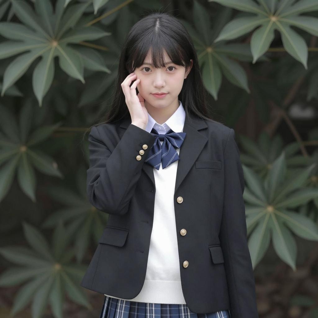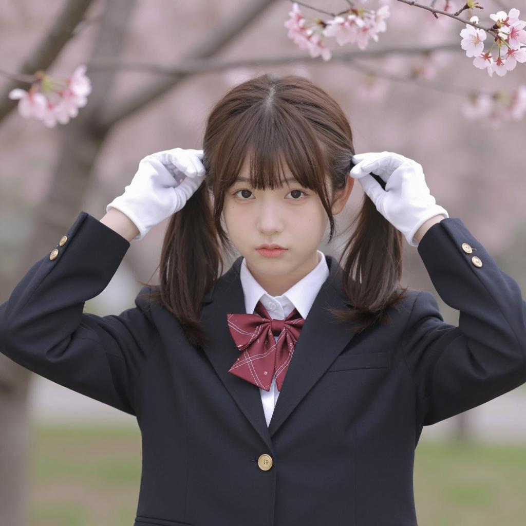 Japanese schoolgirl with pale skin, brown hair in pigtails, wearing black blazer, white shirt, red patterned bow tie, white gloves, hands in hair, standing outdoors, blurry pink cherry blossoms in background, green grass, neutral expression.