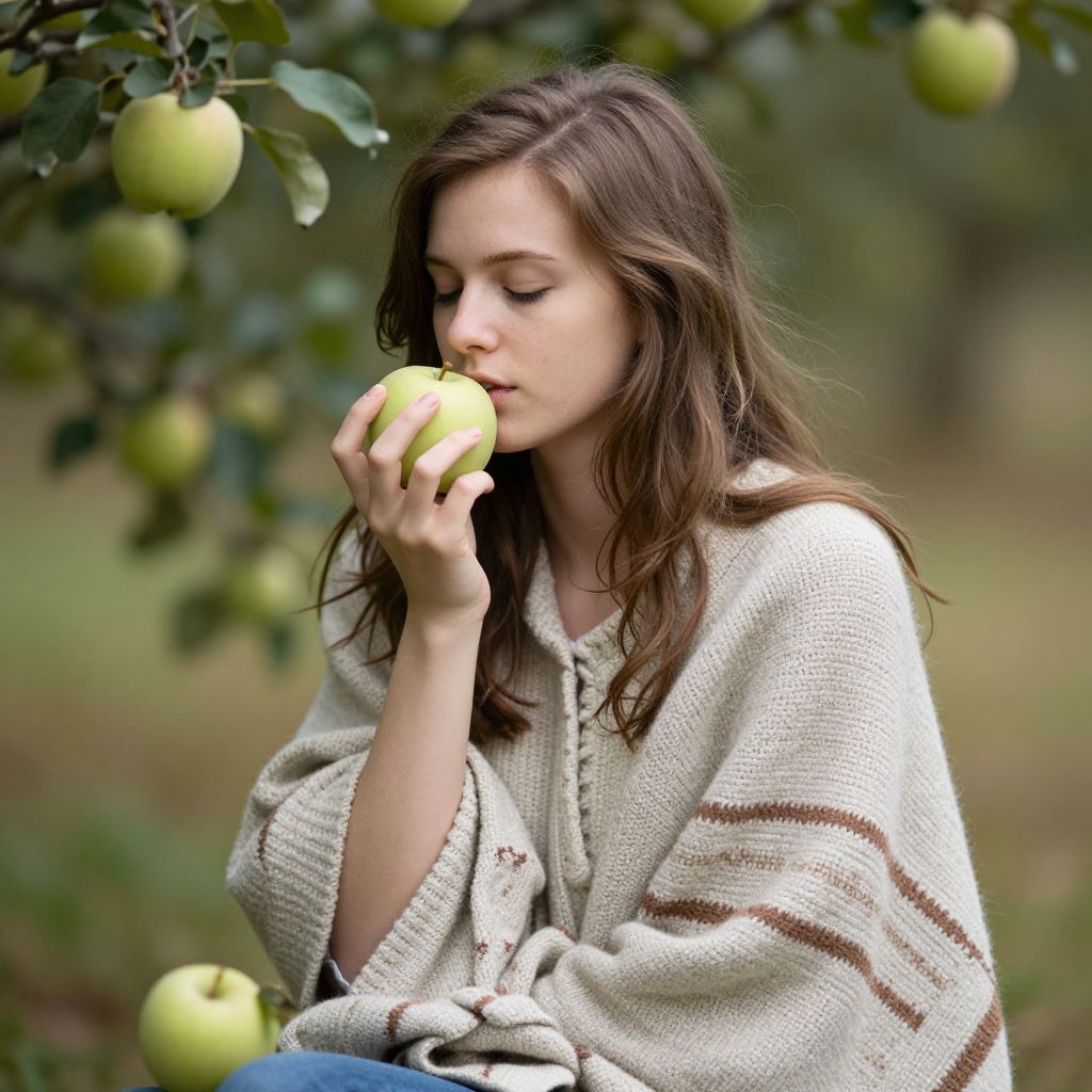 In a serene embrace of nature, a young woman wrapped in a cozy knitted poncho finds solace amidst the gentle rustle of leaves and the earthy aroma of freshly picked apples, savoring a moment of quiet introspection and simple joy.