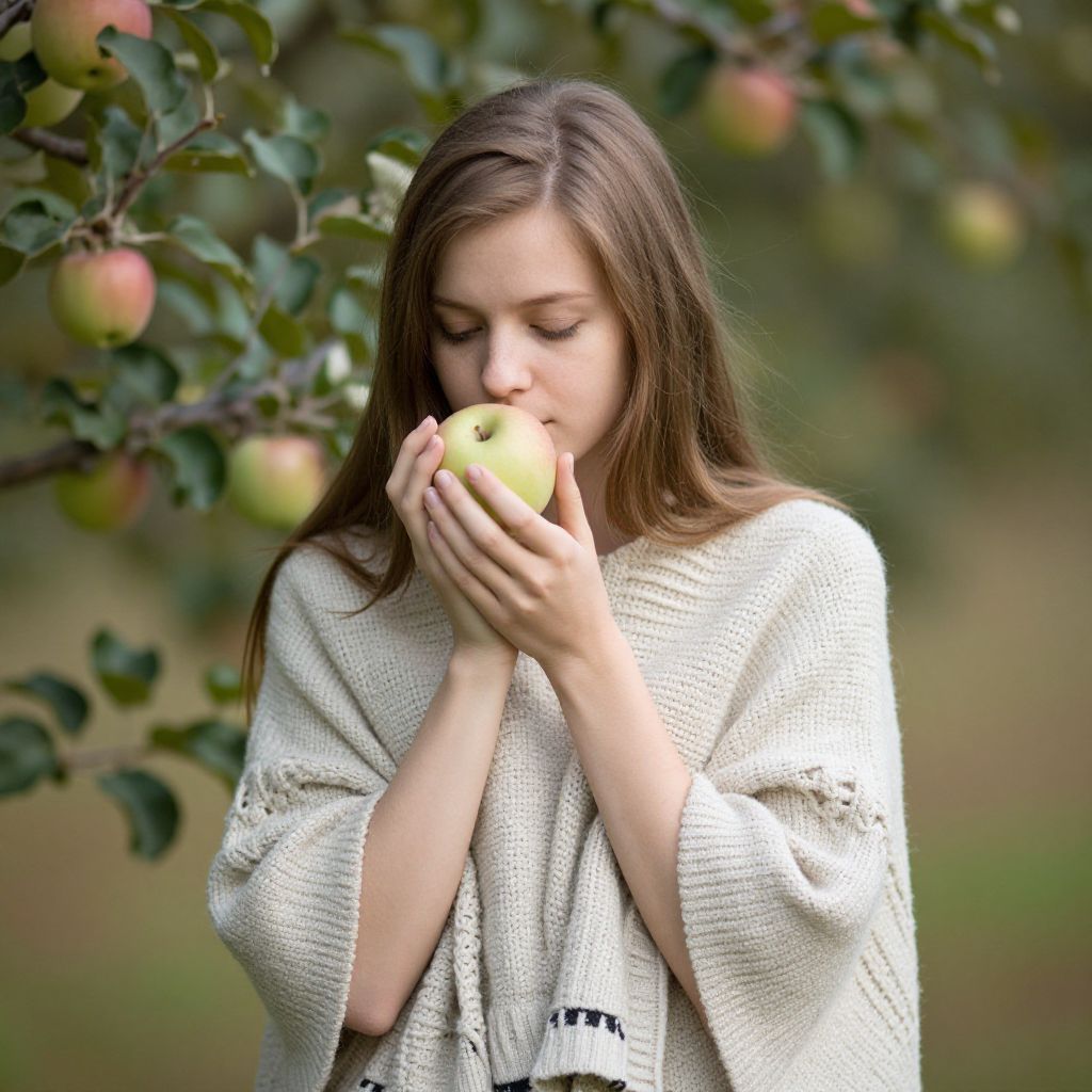 Photograph of a young woman with long brown hair, wearing a beige knitted shawl, gently kissing a green apple under a tree. Blurred