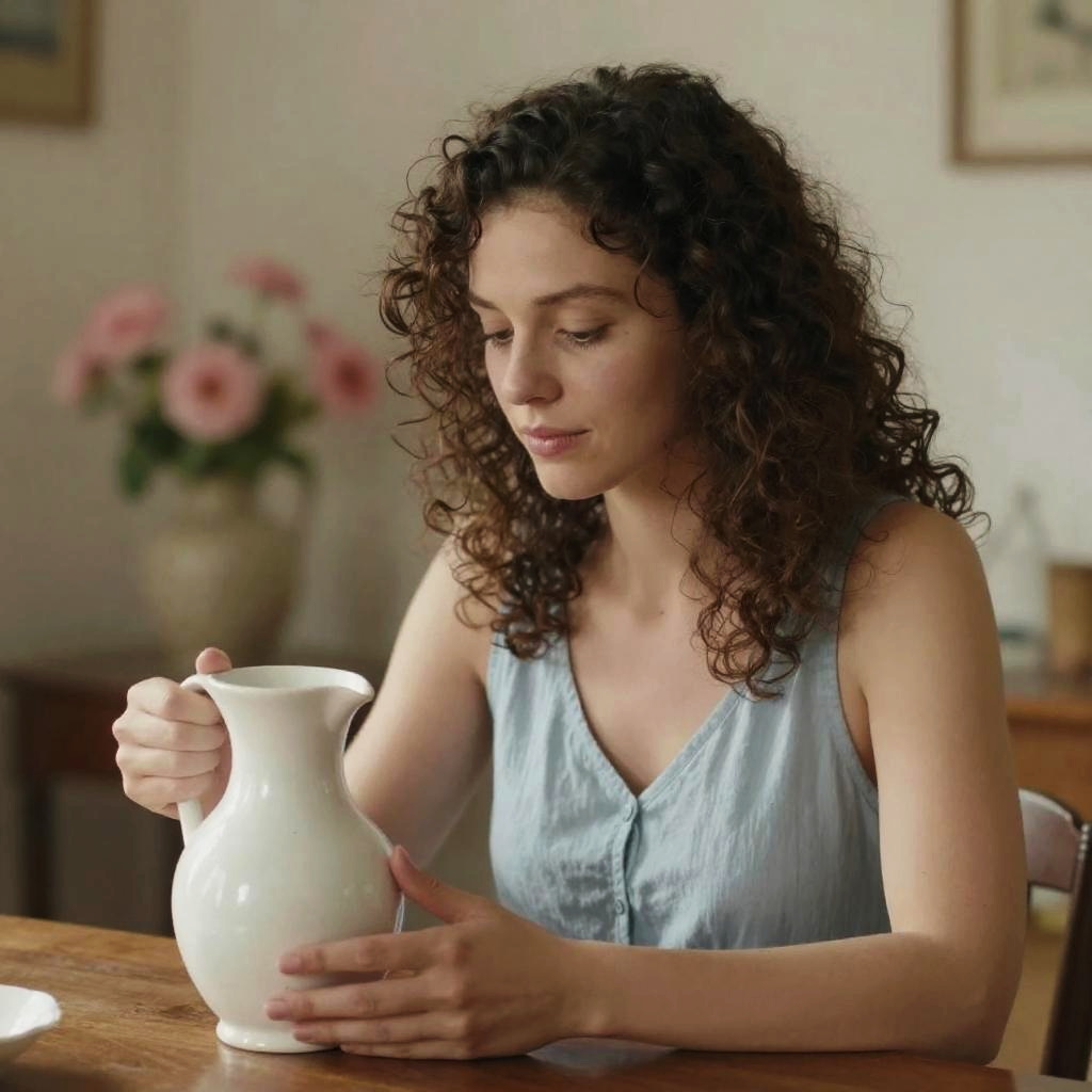 Photograph of a woman with curly brown hair and fair skin, wearing a light blue sleeveless top. She sits at a wooden table in a warmly lit room, focusing on a white ceramic jug in her hands. In the blurry background, there's a vase with pink flowers. The image has a soft, nostalgic feel, with a slight vintage filter.