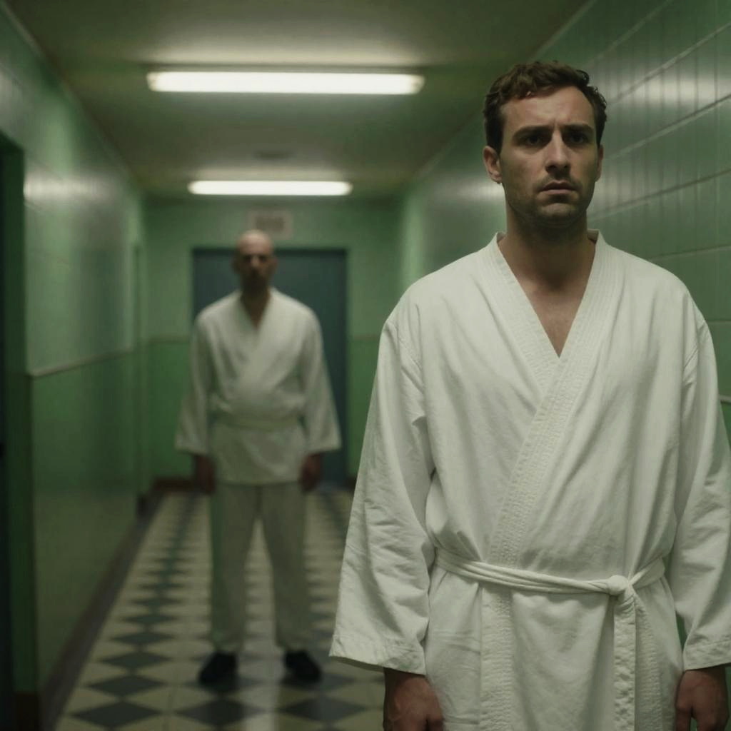 Photograph of a dimly lit, green-tiled hallway with two men. Foreground man with short brown hair, white robe, intense expression. Background man, bald, white shirt, white pants, standing further down the hallway. Fluorescent ceiling lights. Checkered floor.