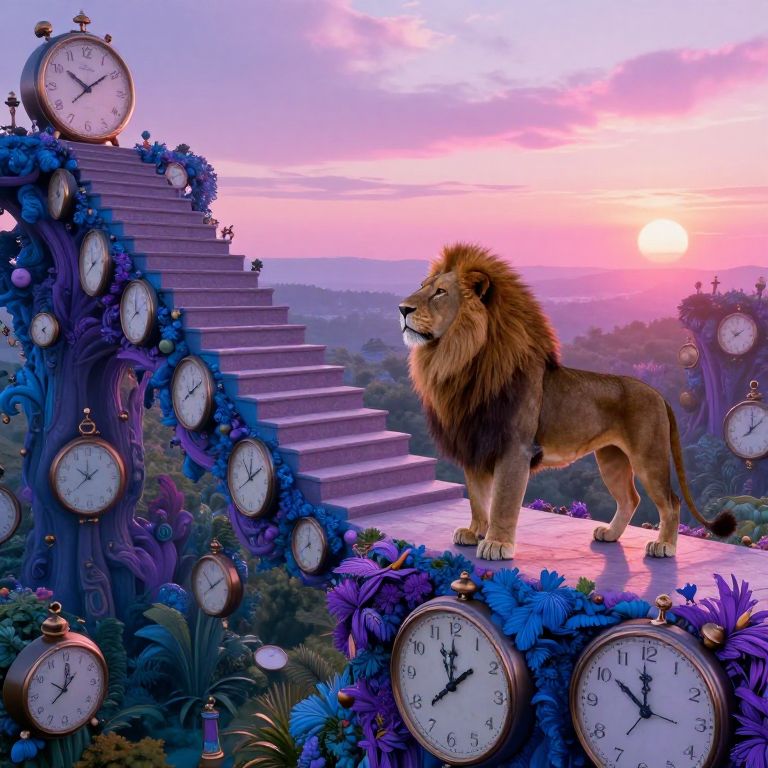 Envision a surreal dreamscape where a grand staircase is formed by floating timepieces, each ticking independently in this whimsical landscape reminiscent of melting clocks. In the foreground, a regal lion stands atop this unique structure, gazing into the distance with an air of contemplation. From an aerial viewpoint, lush vegetation intertwines with scattered clock components, creating a visually captivating puzzle amidst vibrant hues shifting between blue, purple, and pink under the soft light of the setting sun. This imaginative scene seamlessly combines elements of fantasy with enigmatic symbolism, inviting viewers on an emotional journey through the fluidity of time and imagination, evoking feelings of mystery, wonder, and introspection.