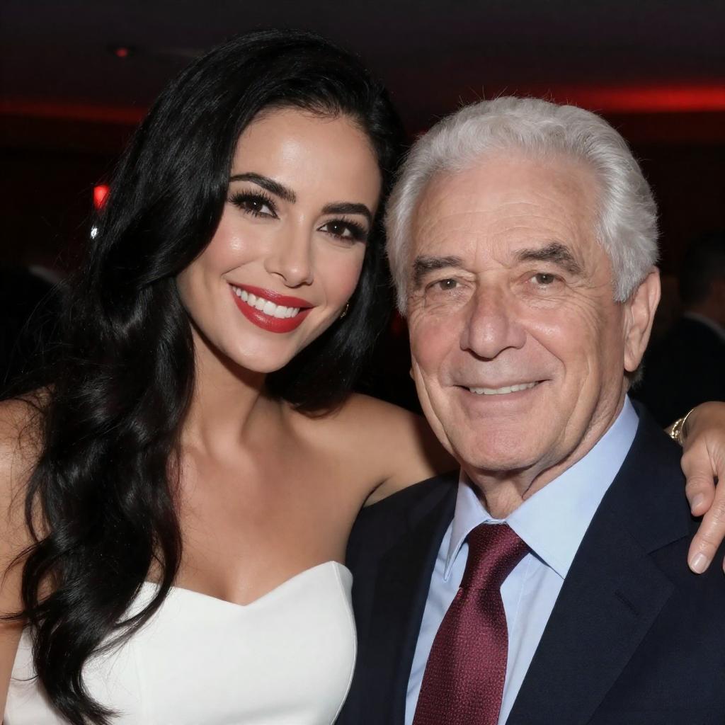 Photograph of an older man and a woman with long black hair. Woman with red lipstick, white strapless top, smiling, leaning close to man. Man with white hair, wrinkles, smiling, wearing dark suit, red patterned tie. Dimly lit background with red lights. Woman's arm around man's shoulder. Both facing camera, smiling.