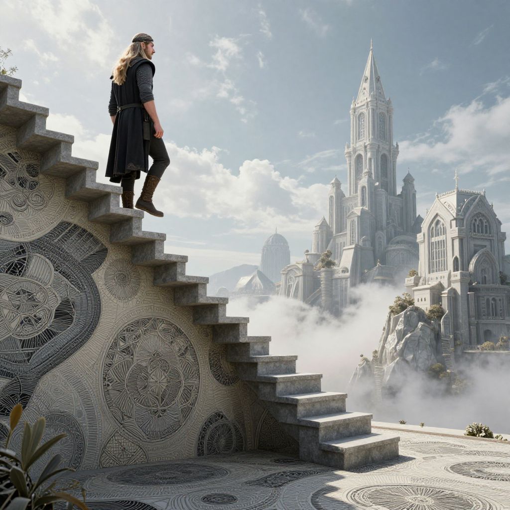 In this digitally created fantasy image, a long-haired, fair-skinned man with a slender build, dressed in a black, long coat and dark trousers, stands on a stone staircase adorned with intricate, circular patterns. He looks out over a foggy, medieval cityscape featuring towering, Gothic-style cathedrals with pointed arches and spires. The staircase is on the left side, while the city's grand architecture occupies the right, bathed in soft sunlight. The sky is partly cloudy, adding a mystical atmosphere to the scene. The detailed textures of the stone and the misty background enhance the fantasy elements of the image.