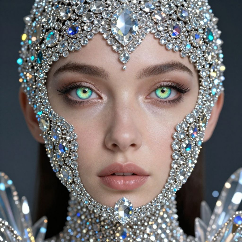 Photographic portrait of a young woman with light skin and striking, neon blue-green eyes. Her face is adorned with a headpiece made of sparkling, gem-like crystals that cover her forehead, eyebrows, and cheeks. The crystals vary in color, including blue, white, and silver. Her expression is neutral, with slightly parted lips. The background is a solid, dark gray, contrasting with the brilliance of the crystals. Her dark hair is partially visible behind the headpiece. The image has a hyper-realistic, almost digital CGI quality, emphasizing the shimmering texture of the crystals and her vivid eye color.