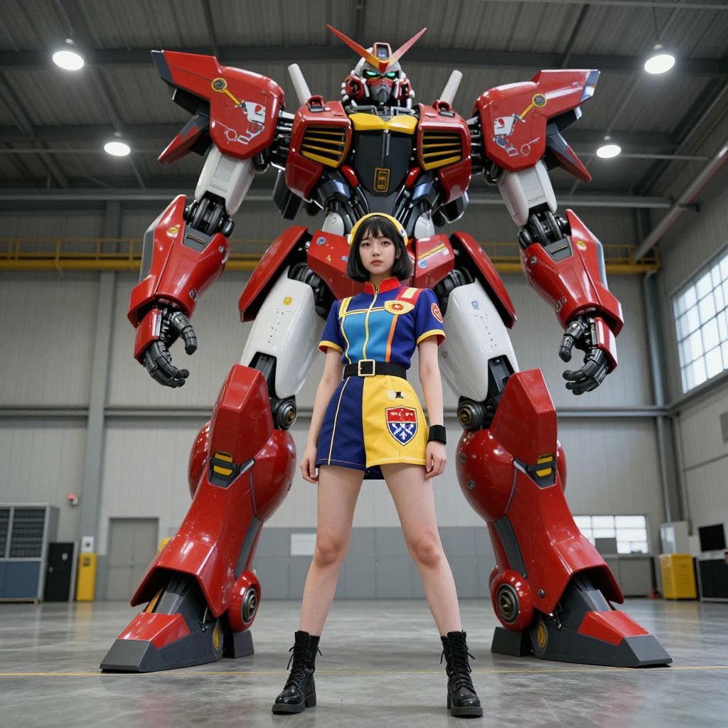 In a spacious hangar, a young woman stands confidently in front of a large, futuristic mecha. She is dressed in a vibrant, colorful outfit adorned with intricate heraldic designs, reminiscent of a pilot's uniform. The mecha, towering behind her, is a striking combination of red, black, and yellow, with intricate mechanical details and a sleek, aerodynamic design. The hangar itself is well-lit, with high ceilings and industrial lighting, creating a stark contrast with the vibrant colors of the mecha and the pilot's attire. The overall composition is dynamic, with the mecha and the pilot positioned in the foreground, drawing the viewer's attention to their striking appearance and the sense of adventure they embody.