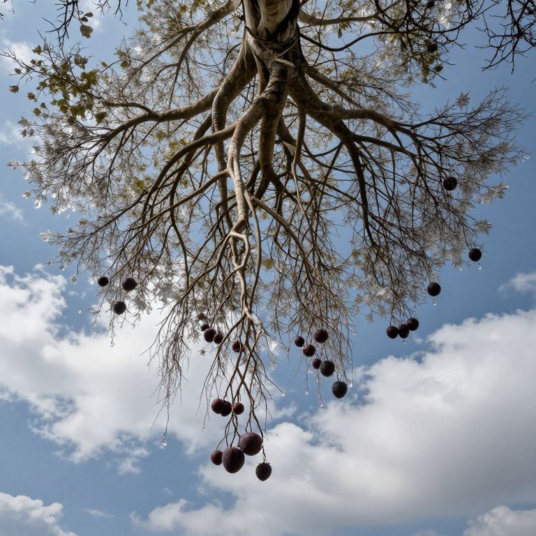Trees grow upside down from the clouds, their roots heavy with crystalline fruits that sing lullabies to the sky.