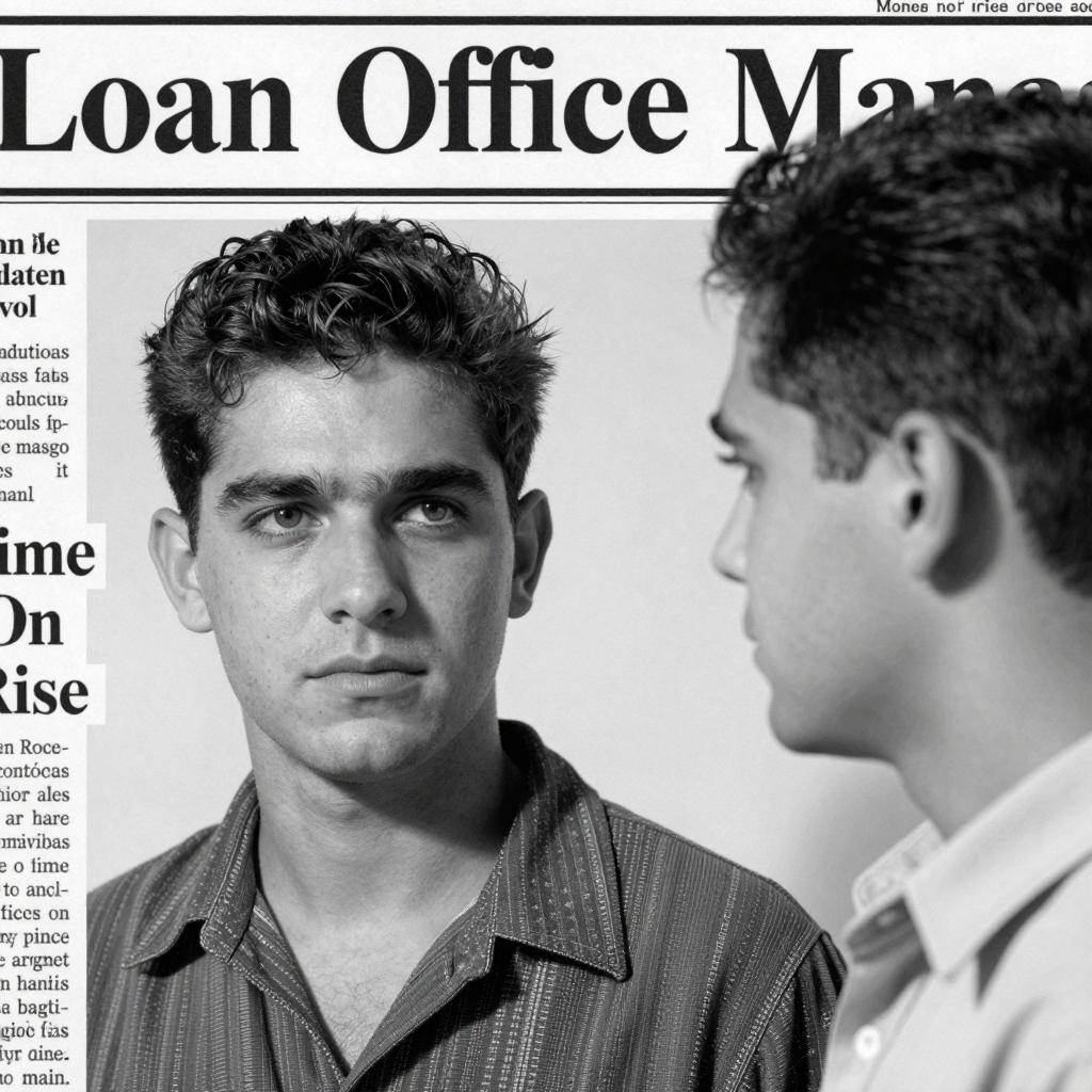 Black and white newspaper photo of two men with short, dark hair. Both men have serious expressions. Left man faces camera, right man in profile. Text above reads "Loan Office Mana". Left man wears patterned scarf, right man in plain shirt. Text on left includes "Time On Rise". Both men have light skin.