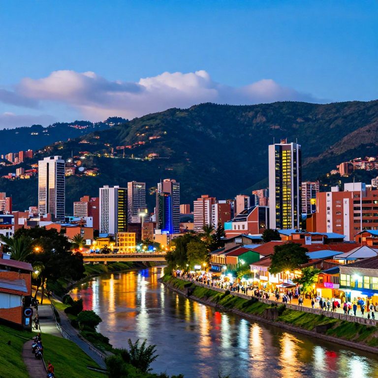 Medellín cityscape at dusk, vibrant colorful lights reflecting off the river, lush green mountains surrounding the city, modern skyscrapers mixed with colonial architecture, lively street markets bustling with people, clear sky with soft clouds, realistic style