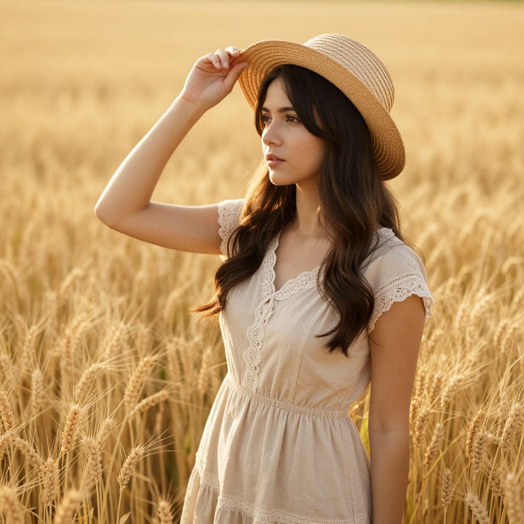 Photograph of a young woman standing in a golden wheat field. She has long, dark brown hair and is wearing a light beige, short-sleeved, lace-trimmed dress with a straw hat. She's holding the hat with her right hand, looking off into the distance with a calm expression. The sunlight creates a warm, golden glow, highlighting the tall wheat stalks around her.
