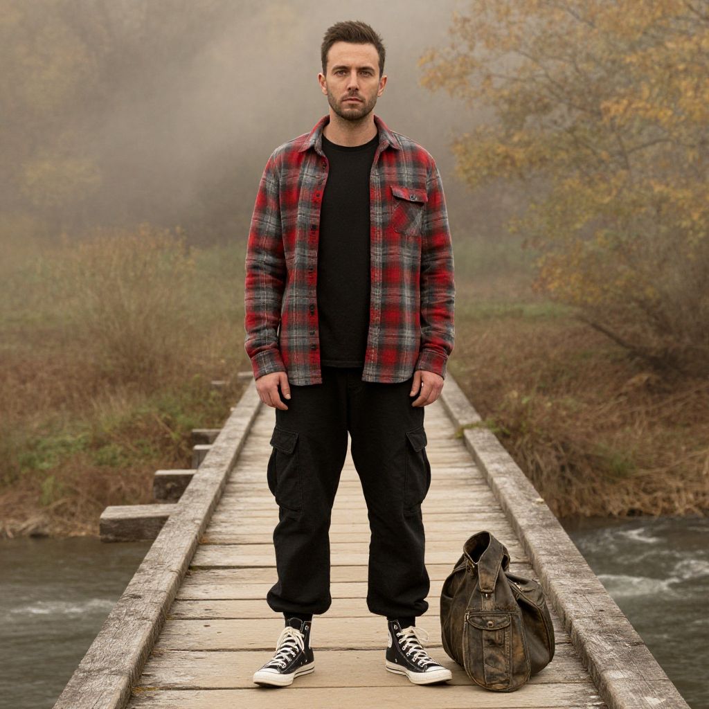 A man, red and grey tartan shirt, loose-fitting black cargo pants, plain black crew neck tee, high-top canvas sneakers, faded leather jacket, rustic wooden bridge, surrounded by autumn foliage, mist rising from the river below, sepia effect, contemplative expression. Man has masculine face and piercing eyes