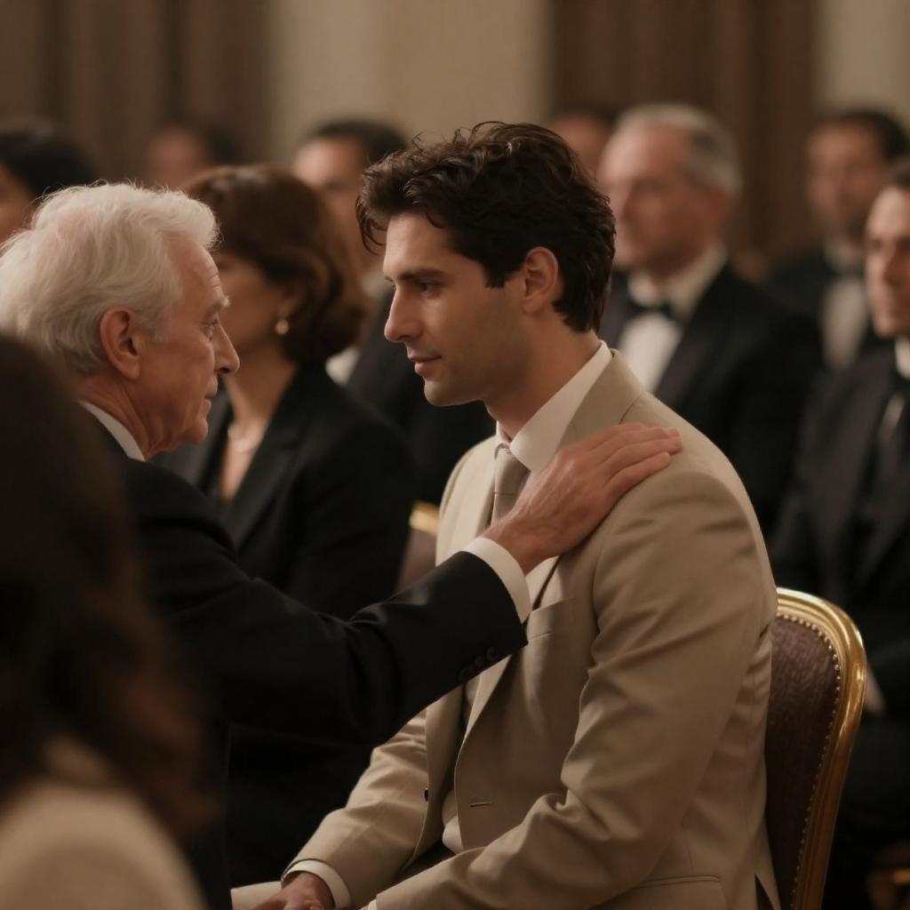 Photograph of two men in a warmly lit room. The older man with gray hair, wearing a gray suit and white shirt, smiles while the younger man with dark hair, in a black polka-dotted shirt, playfully bites his shoulder. Background includes blurred floral decor and a framed picture.