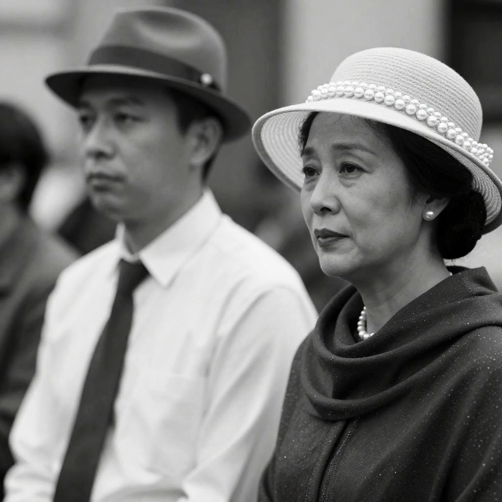 Black-and-white photograph of two people. Man on left with light skin, wearing a hat, collared shirt, and dark necktie. Woman on right with light skin, wearing a large hat adorned with pearls, dark shawl with sparkles. Both looking slightly to the side. Blurred background. Woman's face shows slight intensity. Man's face neutral.