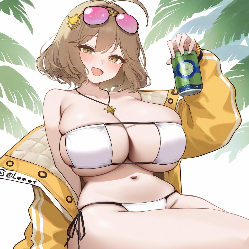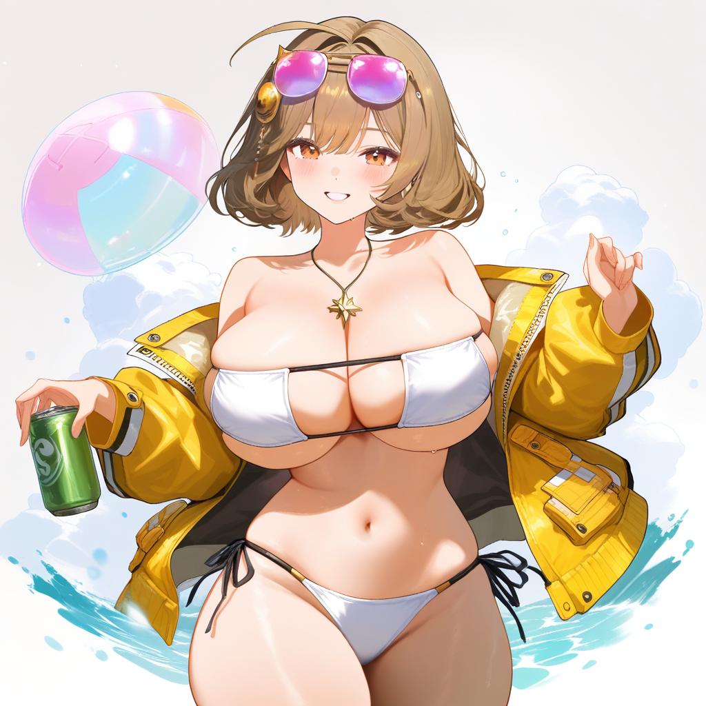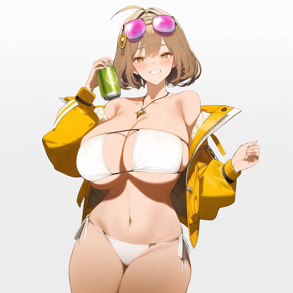 Anis (sparkling summer) (nikke), goddess of victory: nikke, 1girl, yellow eyes, brown eyes, eyewear on head, eyepatch bikini, pink-tinted eyewear, short hair, brown hair, ahoge, large breasts, huge breasts, cleavage, thighs, navel, collarbone, white bikini, yellow jacket, sunglasses, open jacket, side-tie bikini bottom, skindentation, bare shoulders, off shoulder, long sleeves, necklace, drink can, stomach, soda can, by artist bullfalk, animagine