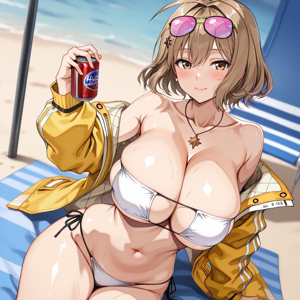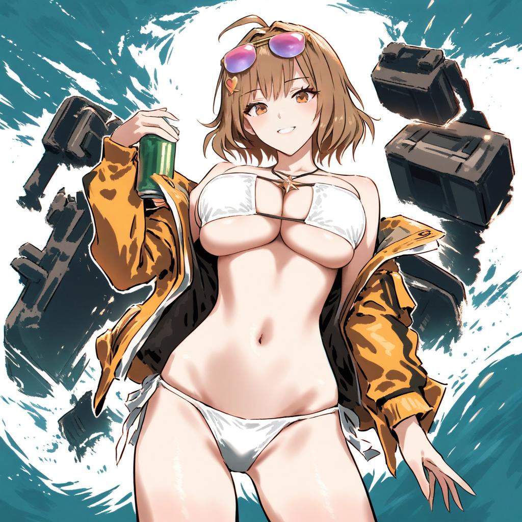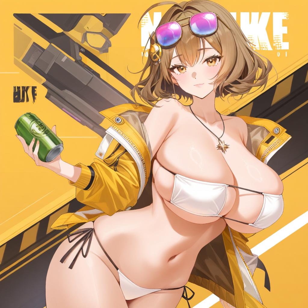 Anis (sparkling summer) (nikke), goddess of victory: nikke, 1girl, yellow eyes, brown eyes, eyewear on head, eyepatch bikini, pink-tinted eyewear, short hair, brown hair, ahoge, large breasts, huge breasts, cleavage, thighs, navel, collarbone, white bikini, yellow jacket, sunglasses, open jacket, side-tie bikini bottom, skindentation, bare shoulders, off shoulder, long sleeves, necklace, drink can, stomach, soda can, by artist bullfalk, animagine