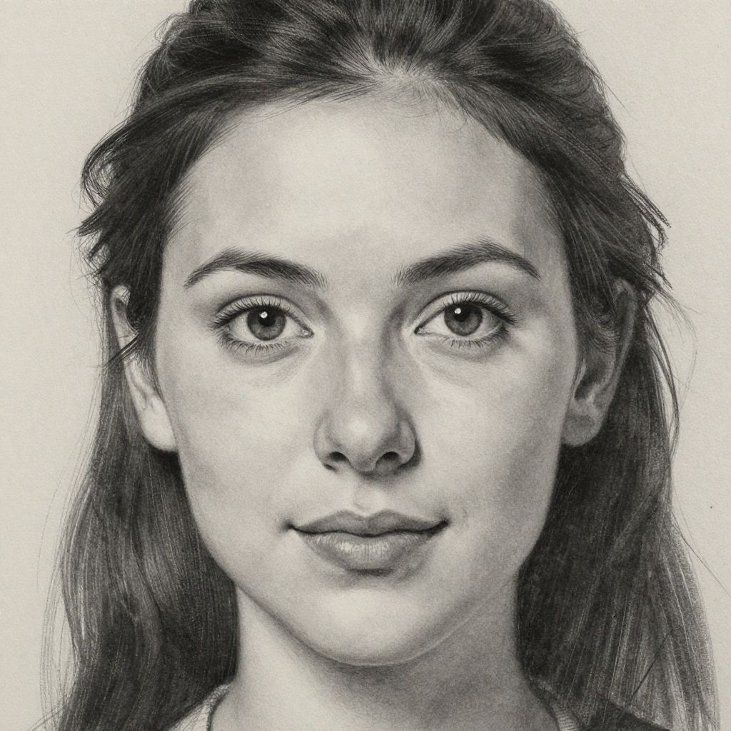 This is a highly detailed, black-and-white pencil drawing of a young woman with light skin, straight dark hair, and expressive, large eyes. She has a small, subtle smile and a straight nose. Her eyebrows are slightly arched, and her hair is loosely parted in the middle, cascading down her shoulders. The background is plain white, emphasizing her facial features. The drawing showcases fine pencil strokes, creating realistic textures in her skin and hair. Her expression is calm and neutral, making her appear approachable and serene. The style is realistic, capturing minute details with precision.