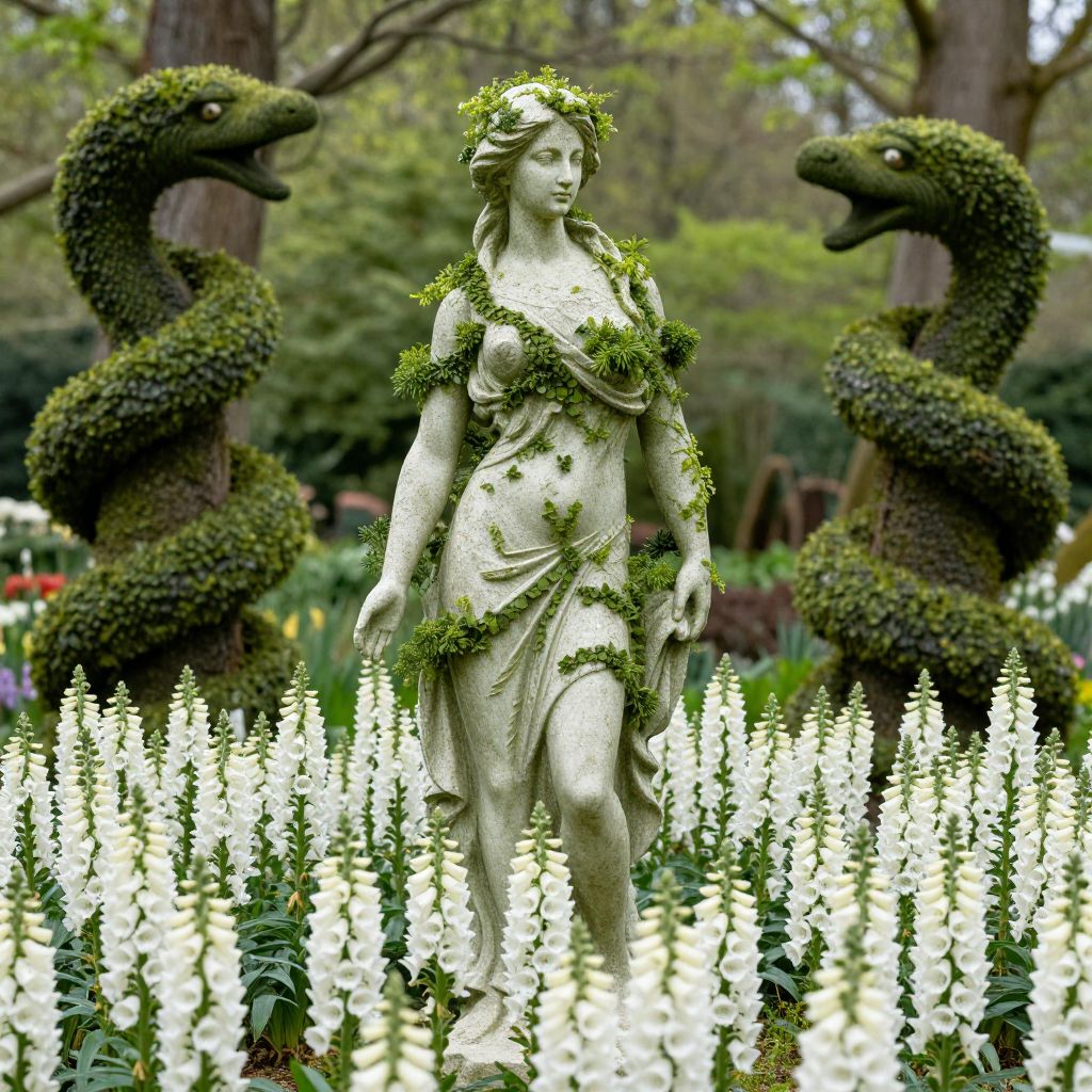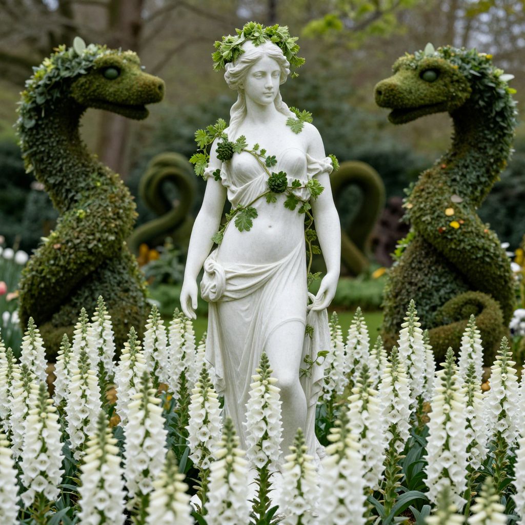 A classical statue of a woman, adorned with living greenery, stands ethereally amidst a bed of pristine white foxgloves, while swirling topiaries twist like serpents in the verdant backdrop, creating a dreamlike fusion of nature and artistry.