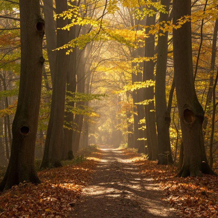Mist-draped forest path winds through towering trees, their trunks marked by hollows, while golden sunlight filters through vibrant foliage, casting dappled shadows over scattered autumn leaves.